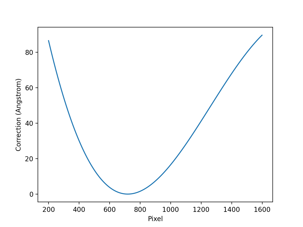 PVterms:import numpy as np import matplotlib.pyplot as plt from astropy.wcs import WCS import astropy.units as u from specreduce.utils.synth_data import make_2d_arc_image non_linear_header = { 'CTYPE1': 'AWAV-GRA', # Grating dispersion function with air wavelengths 'CUNIT1': 'Angstrom', # Dispersion units 'CRPIX1': 719.8, # Reference pixel [pix] 'CRVAL1': 7245.2, # Reference value [Angstrom] 'CDELT1': 2.956, # Linear dispersion [Angstrom/pix] 'PV1_0': 4.5e5, # Grating density [1/m] 'PV1_1': 1, # Diffraction order 'PV1_2': 27.0, # Incident angle [deg] 'PV1_3': 1.765, # Reference refraction 'PV1_4': -1.077e6, # Refraction derivative [1/m] 'CTYPE2': 'PIXEL', # Spatial detector coordinates 'CUNIT2': 'pix', # Spatial units 'CRPIX2': 1, # Reference pixel 'CRVAL2': 0, # Reference value 'CDELT2': 1 # Spatial units per pixel } linear_header = { 'CTYPE1': 'AWAV', # Grating dispersion function with air wavelengths 'CUNIT1': 'Angstrom', # Dispersion units 'CRPIX1': 719.8, # Reference pixel [pix] 'CRVAL1': 7245.2, # Reference value [Angstrom] 'CDELT1': 2.956, # Linear dispersion [Angstrom/pix] 'CTYPE2': 'PIXEL', # Spatial detector coordinates 'CUNIT2': 'pix', # Spatial units 'CRPIX2': 1, # Reference pixel 'CRVAL2': 0, # Reference value 'CDELT2': 1 # Spatial units per pixel } non_linear_wcs = WCS(non_linear_header) linear_wcs = WCS(linear_header) # this re-creates Paper III, Figure 5 pix_array = 200 + np.arange(1400) nlin = non_linear_wcs.spectral.pixel_to_world(pix_array) lin = linear_wcs.spectral.pixel_to_world(pix_array) resid = (nlin - lin).to(u.Angstrom) plt.plot(pix_array, resid) plt.xlabel("Pixel") plt.ylabel("Correction (Angstrom)") plt.show()