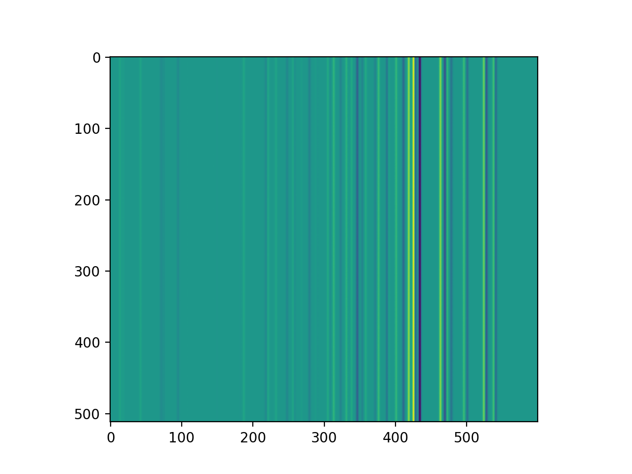 nlin_im = make_2d_arc_image( nx=600, ny=512, linelists=['HeI', 'NeI'], line_fwhm=3, wave_air=True, wcs=non_linear_wcs ) lin_im = make_2d_arc_image( nx=600, ny=512, linelists=['HeI', 'NeI'], line_fwhm=3, wave_air=True, wcs=linear_wcs ) # subtracting the linear simulation from the non-linear one shows how the # positions of lines diverge between the two cases plt.imshow(nlin_im.data - lin_im.data) plt.show()