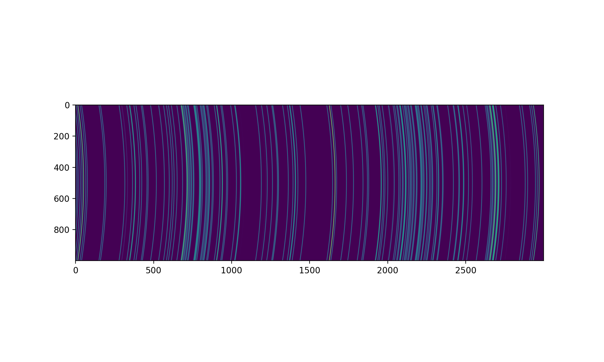 import matplotlib.pyplot as plt import numpy as np from astropy.modeling import models import astropy.units as u from specreduce.utils.synth_data import make_2d_arc_image model_deg2 = models.Legendre1D(degree=2, c0=50, c1=0, c2=100) im = make_2d_arc_image( linelists=['HeI', 'ArI', 'ArII'], line_fwhm=3, tilt_func=model_deg2 ) fig = plt.figure(figsize=(10, 6)) plt.imshow(im)